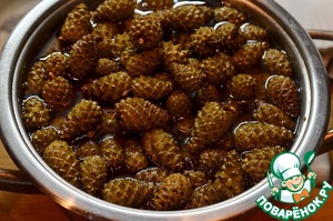За 15 минут до окончания варки верните шишки в кастрюлю и доварите варенье.