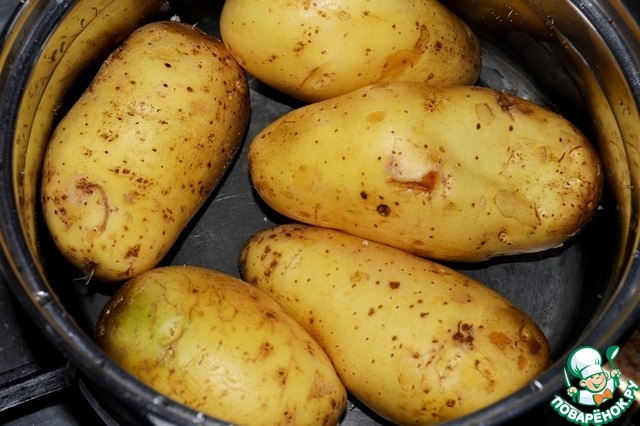 Картофель моем и отвариваем в кожуре до готовности. Яйца также варим до готовности и остужаем.