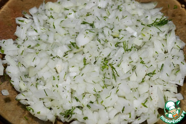 Лук чистим и мелко режем. Добавляем измельченный укроп, солим, перчим и сбрызгиваем рисовым уксусом. Перемешиваем и даем луку замариноваться.