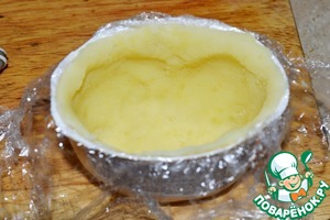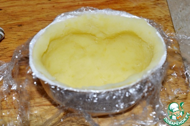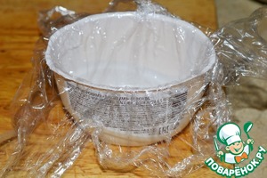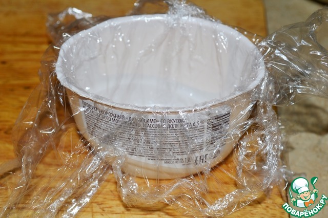 Подготовленную формочку (у меня коробочка из под йогурта) застилаем пленкой.