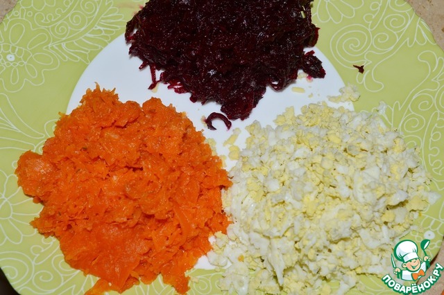 Свеклу, морковь и яйца натираем на мелкой терке.