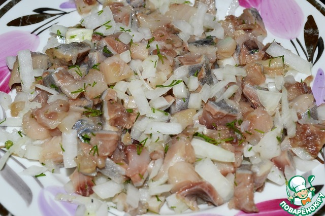 Сельдь разделываем удаляем кости и шкурку. Режем мелкими кусочками и смешиваем с маринованным луком.