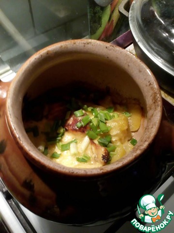 Я просто и лук, и картошку сырыми в горшочки положила. Делала диетический вариант, чтоб ребенок мог покушать. А в принципе можно и картошку обжарить, и лук. У меня еще сорт картофеля такой, который хорошо разваривается. Вам может подольше нужно было подержать в духовке, картофель вероятнее всего менее разваристый, чем у меня.