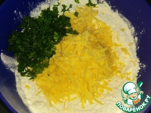 Муку смешать с солью, разрыхлителем, мелко нарезанной зеленью (у меня укроп, петрушка, зеленый лук) и натертым сыром.