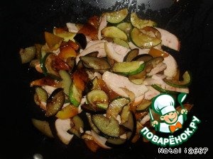 Все ингредиенты смешать(кроме помидор) и обжарить минут 5.