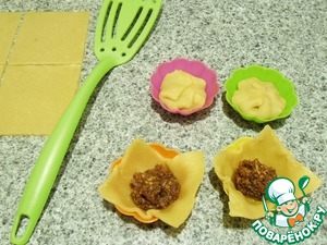 Разложить заготовки по формам, в центр каждой начинку по 1 ч. л.