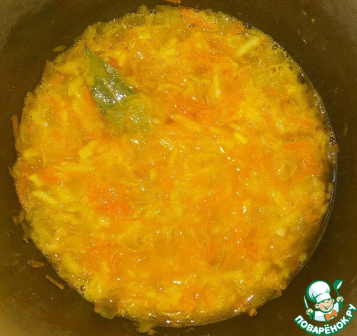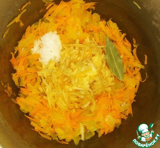 Добавить очищенное натертое на крупной терке яблоко, лавровый лист и соль, перемешать.