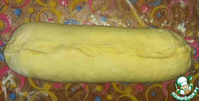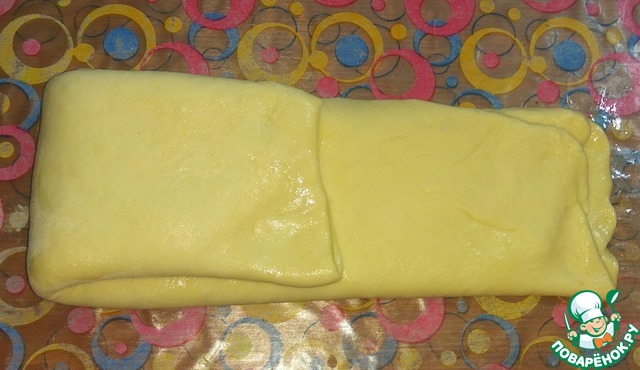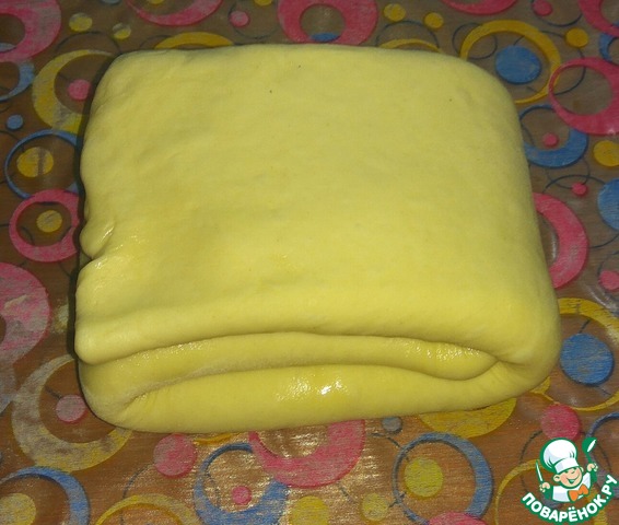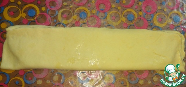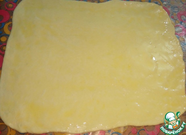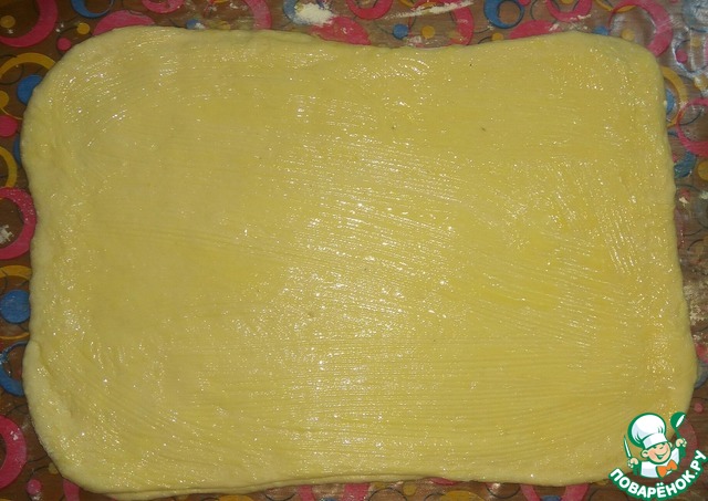 Подошедшее тесто раскатать в тонкий прямоугольник, подпыляя немного мукой. Чем тоньше, тем больше слоистость будет.
