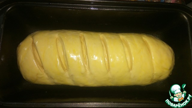 Выкладываем в форму, смазанную маслом, швом вниз. Смазываем яйцом. Оставляем на расстойку на 20 минут.