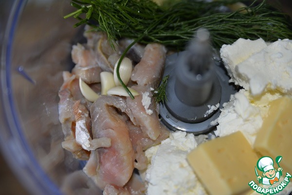 Готовим начинку. В чашу комбайна кладём творожный сыр, твёрдый сыр, малосольную горбушу (порезанное филе), чеснок, укроп, наливаем сок лимона.