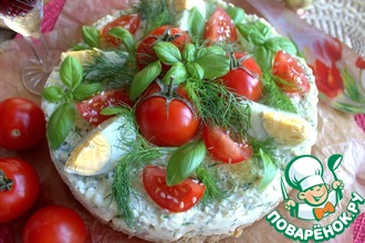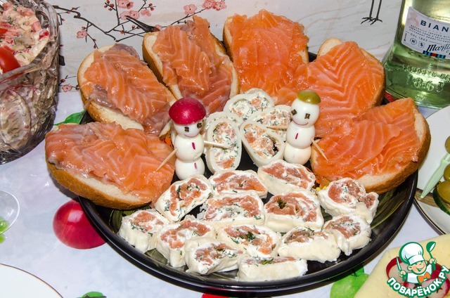И рыбку красную я бы порубила мелкими кусочками, так красивее на разрезе будет.