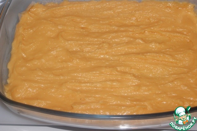 Распределить тесто в форму 27Х20 (у меня пирекс) ровным слоем.
