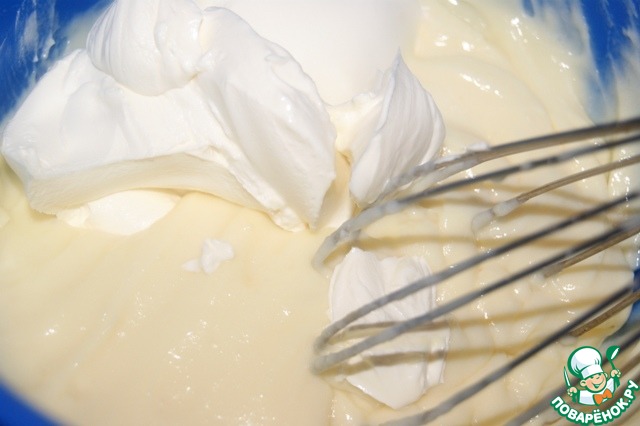 Добавить к пудингу сливочный сыр и растопленный остывший шоколад. -