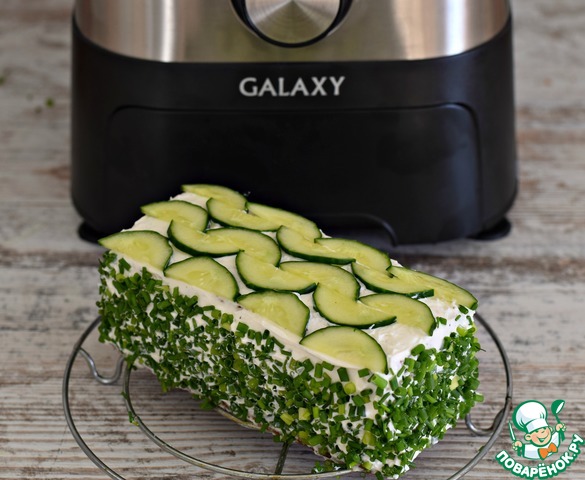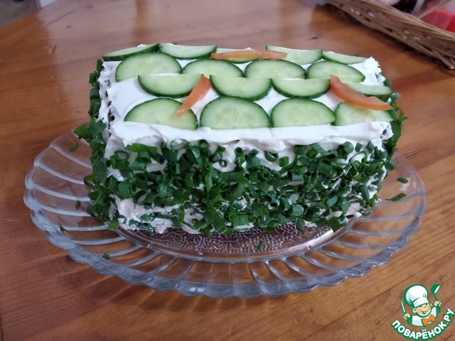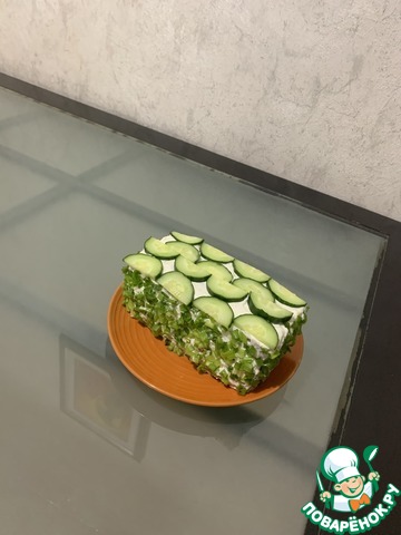 Сверху украсить кекс кружочками огурца. Поставить кекс в холодильник минимум на полчаса. Но, как я говорила, закуску можно приготовить заранее.