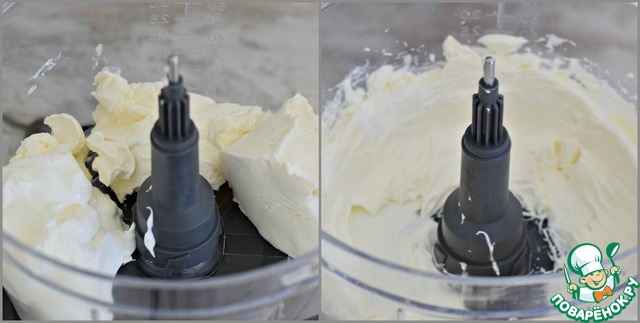 Творожный сыр и сметану (20% жирности) выложить в чашу кухонного комбайна и перемешать до однородности.
