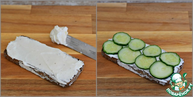 Ломтик хлеба смазать творожным кремом. На крем выложить кружочки огурца. -