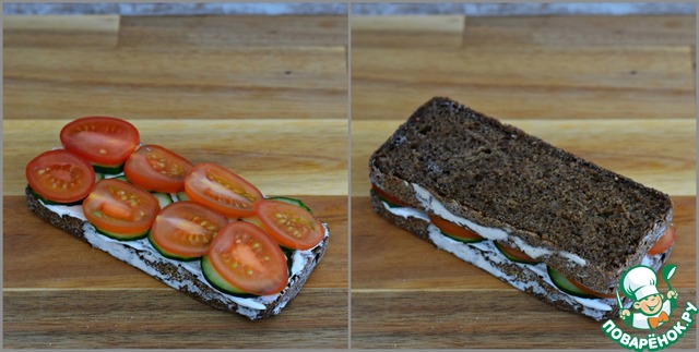 На огурец положить кружочки помидоров и прикрыть бутерброд вторым кусочком хлеба.
