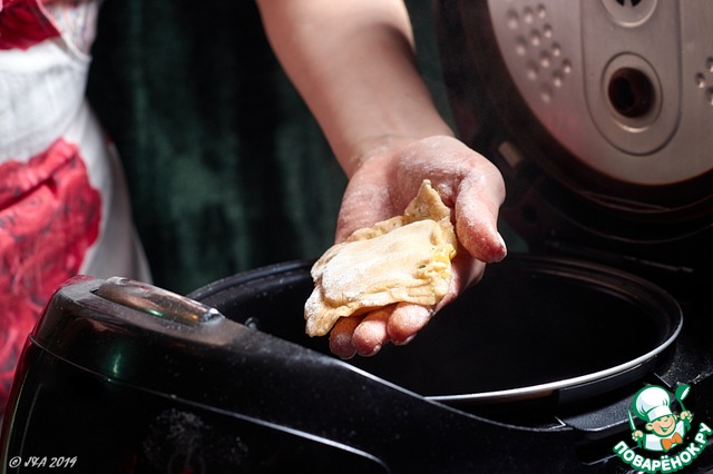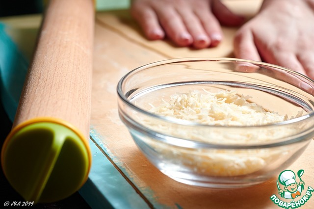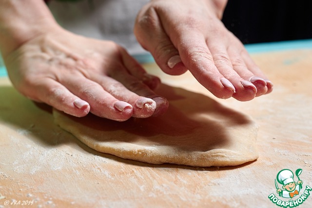 Если есть машинка для пасты- воспользуйтесь ею, а если нет- скалкой. Сначала немного растяните тесто руками.