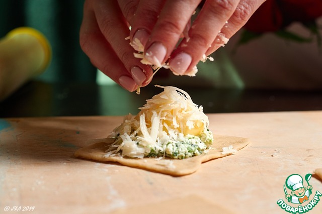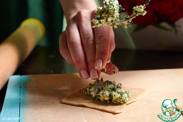 На квадратик выложить творог со шпинатом. Равиоли- не пельмени- теста должно быть больше, чем начинки, поэтому не надо щедро валить, хватит чайной ложки на квадрат размером с ладонь.