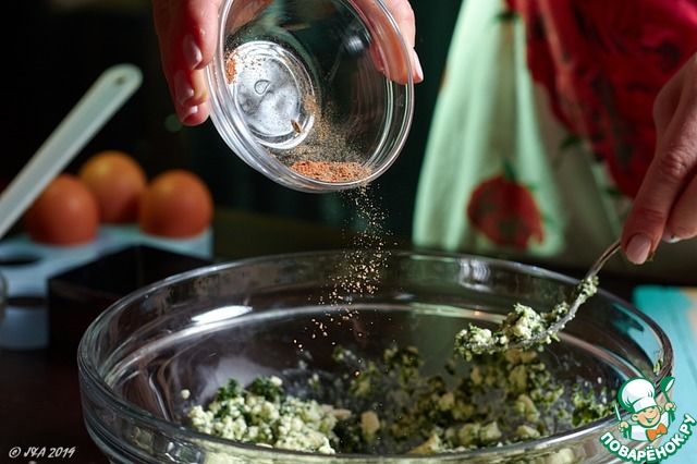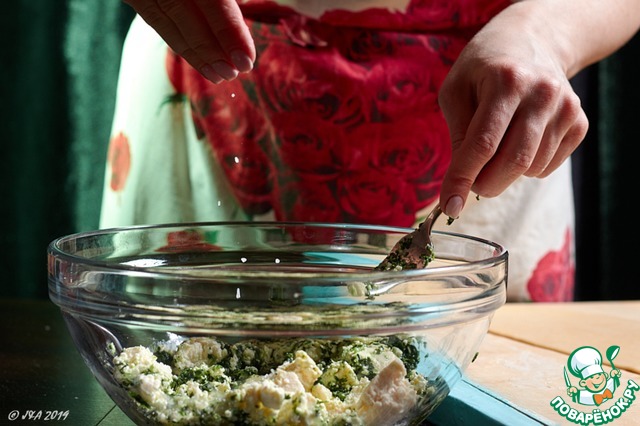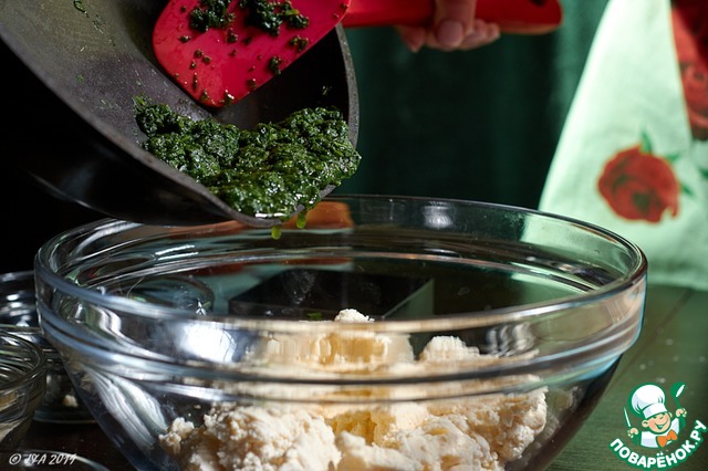 Шпинат потушить до мягкости в небольшом количестве воды. Выложить его к творогу.