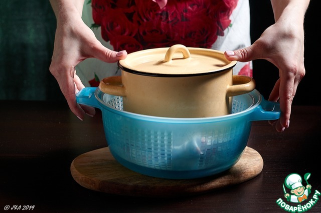 Выстелить дуршлаг марлей или полотенцем. Я свою стираю с кипячением и глажу с двух сторон.