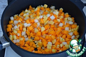 Тыкву, яблоки и репчатый лук нарезать кубиком. -
