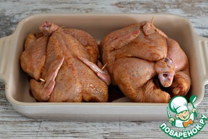 Связать ножки птичек кулинарной нитью, крылышки подколоть к тушке зубочистками. Так цыплята во время запекания не "раскроются".
