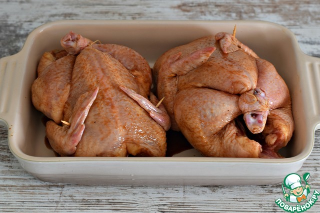Смешать соевый соус, чесночный порошок, мед (или сахарный сироп), паприку и оливковое масло. Обмазать маринадом цыплят (у меня два цыпленка по 550 граммов каждый) снаружи и изнутри, положить в форму для запекания. Оставить мариноваться минимум на полчаса.