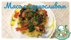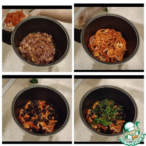 Далее все еще проще. На дно мультиварки выкладываем мясо, затем сверху перец и чернослив, зелень, по желанию, можно как при готовке, таки в конце при подаче. ставлю на режим тушение на 30 минут.