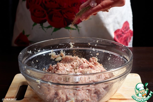 Добавьте черного перца и мускатного ореха. Тщательно вымесите.