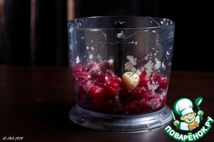 Добавить к ней чеснок, сахар, немного соли и специй, воды, уксус и пробить до однородности.