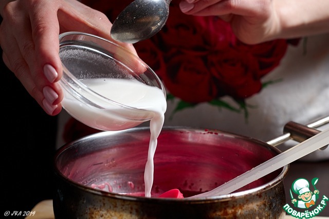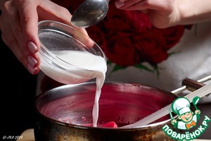Частью воды развести крахмал и влить в массу, постоянно помешивая. Можно для вкуса добавить капельку Наршараба. Довести до кипения постоянно помешивая. При кипении на поверхности образуется белая крахмальная пленочка. На медленном огне доведите так, чтобы она, постепенно поднимаясь по стенкам, как бы схлопнулась в центре. Тогда наш соус из мутного станет рубиново-красным и прозрачным. Перемешайте.
