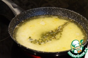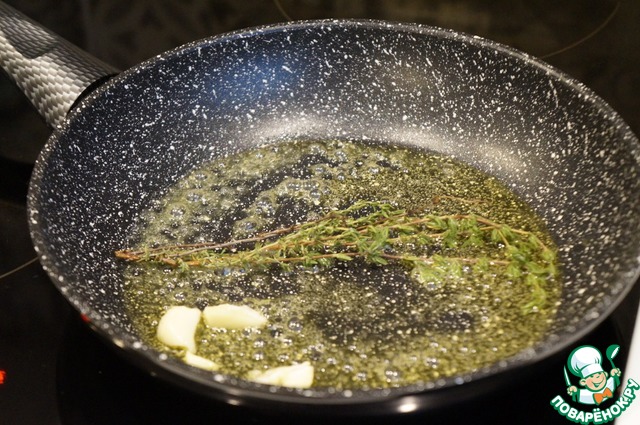 На сковороду добавить оба вида масла. Зубчик чеснока придавить широкой стороной ножа, порезать на 2 части, кинуть в масло. Положить тимьян. Обжаривать несколько минут на среднем огне. Затем чеснок выкинуть, а тимьян отложить.