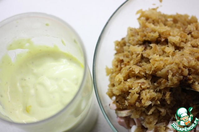 Кальмар очистить и отварить в подсоленной воде около 2-3 минут (не больше).
