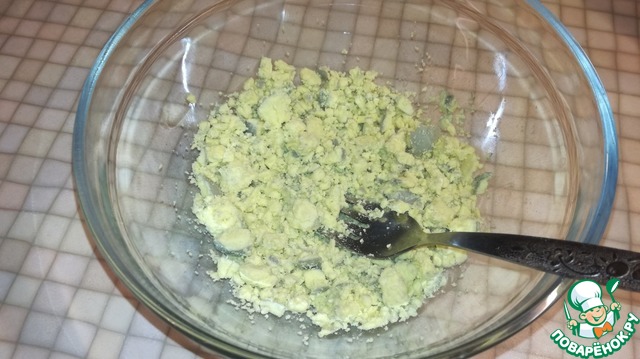 Яйца почистить, разрезать на половинки. Аккуратно достать желтки и растереть в глубокой миске.