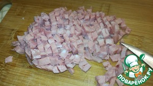 Ветчину порезать мелкими кубиками. Добавить в миску к желткам.