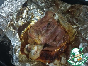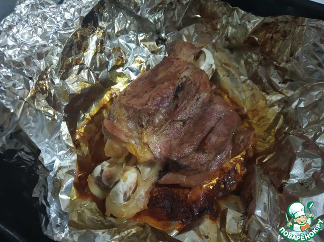 Через час раскрываем фольгу, повышаем температуру до 200 градусов, и запекаем мясо до образования румяной корочки.