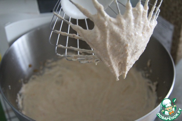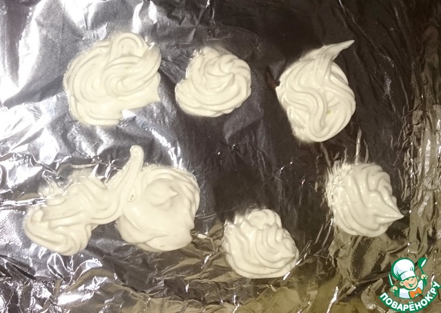 В охлажденное пюре с сахаром добавить белок и взбивать, постепенно увеличивая скорость миксера, до стойких пиков.