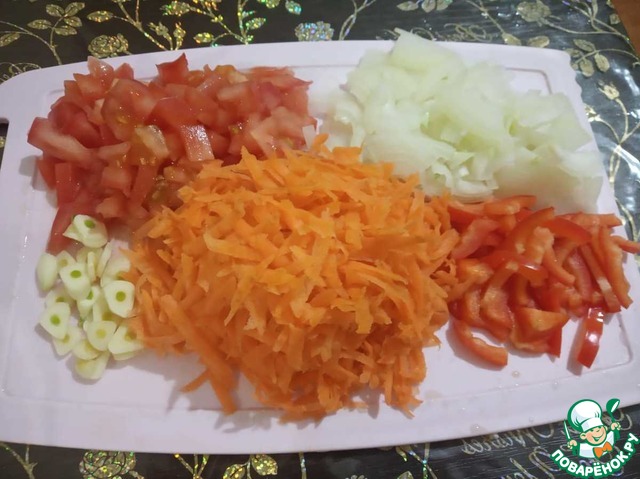Подготовим все овощи. Морковь натираем на тёрке, лук и болгарский перец режем небольшой соломкой, помидор - небольшими кубиками, нарежем чеснок.