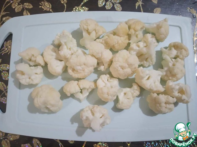 Цветную капусту разбираем на небольшие соцветия. Опускаем в кипящую подсоленную воду на пару минут. Сливаем горячую воду и чуть споласкиваем холодной.