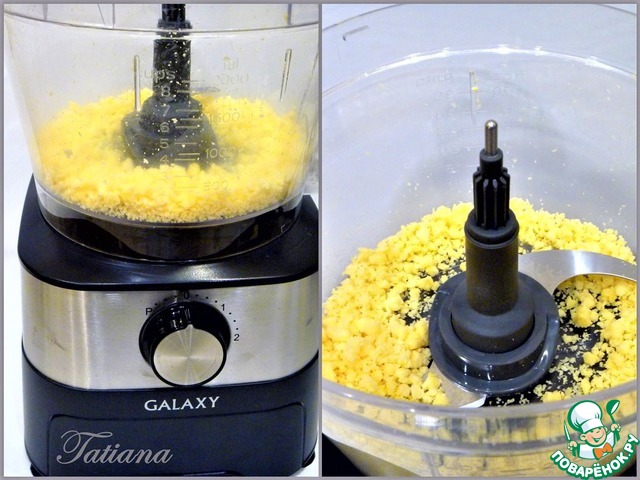 В кухонном комбайне (насадка нож для измельчения) измельчите сыр в мелкую крошку, выложите на тарелку.