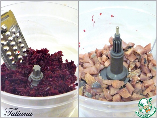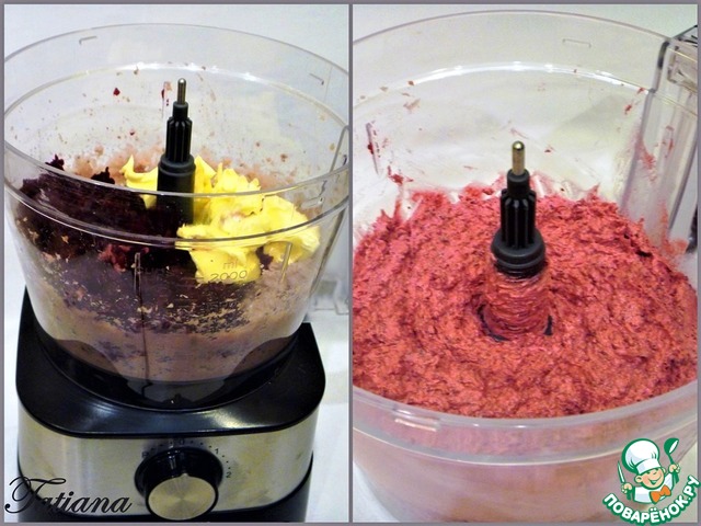 Свеклу заранее сварите или запеките. Достаньте из холодильника сливочное масло. Очищенную свеклу измельчите в кухонном комбайне (насадка для шинковки), выложите на тарелку (сок отожмите). В чашу комбайна установите насадку нож для измельчения, порежьте кусочками сельдь, измельчите.