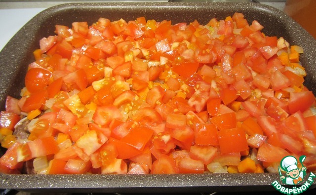 Нарезаем кубиками помидоры, выкладываем поверх овощей, наливаем в форму вино и бульон. Добавляем специи. Ставим в духовку на 1,5 часа до выпаривания жидкости.