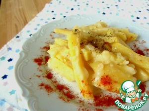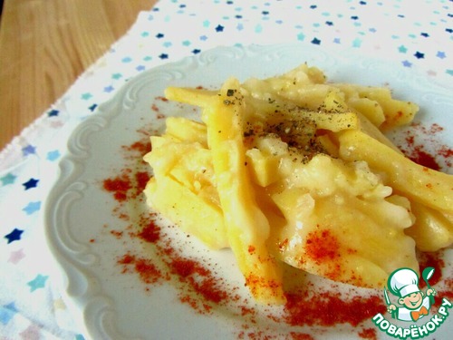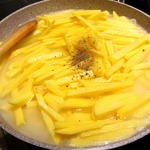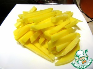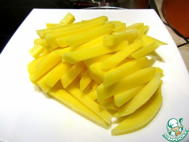 Наливаем вино и воду, размешиваем получившийся соус. Нарезаем соломкой картофель, помещаем на сковороду.