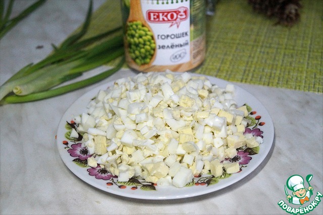 Яйца очистить от скорлупы и нарезать кубиками.