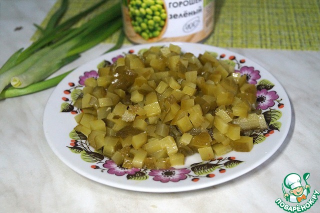 Кубиками нарезать маринованные огурцы.