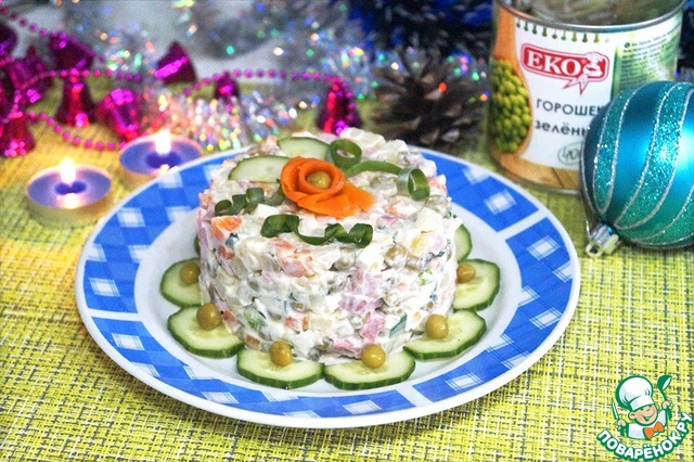 Оливье - популярный салат на праздничном столе. Со временем рецепт салата подвергся некоторым изменениям : мясо часто заменяют на варёную колбасу и добавляют варёную морковь с консервированным горошком. У каждой хозяйки свой рецепт этого салата. Я предлагаю приготовить салат "Оливье" с мясным ассорти ( свининой, говядиной, бужениной, вареной или полукопченой колбасой). А оригинальная подача обязательно порадует вас и ваших гостей!