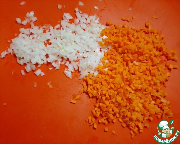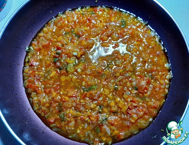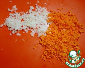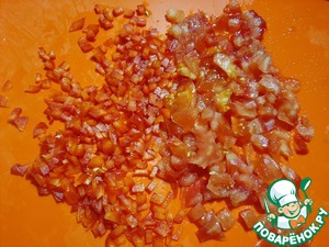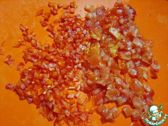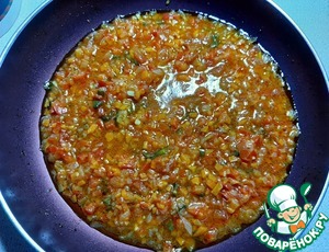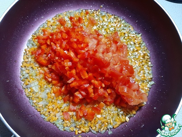 Спассировать лук и морковь на растительном масле, добавить болгарский перец и помидор, потушить минут 10, добавив воды.