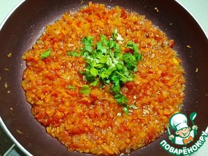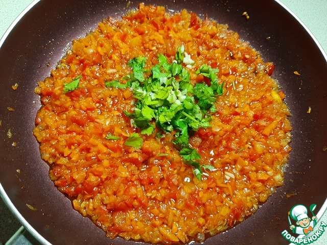 Чеснок и зелень порубить, добавить в подливку, потушить еще минуты 3.