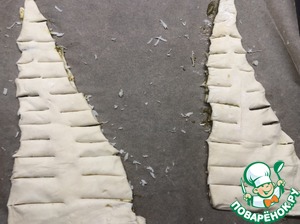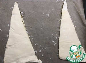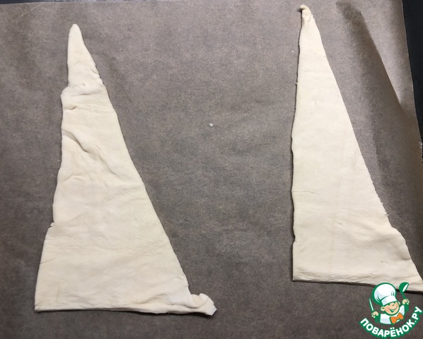 Размораживаем слоеное тесто. Вырезаем два треугольника из теста. (Я делала два небольших пирога, соотвественно, вырезала 4 треугольника)